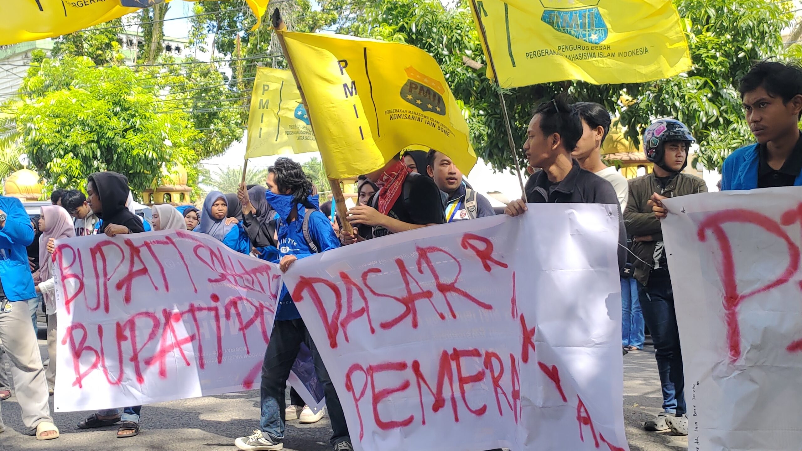 Sebelum menggelar aksi di halaman kantor bupati, massa PMII lebih dulu melakukan orasi di sepanjang Jalan Ahmad Yani sambil membakar ban sebagai bentuk kekecewaan terhadap kebijakan pemerintah daerah.