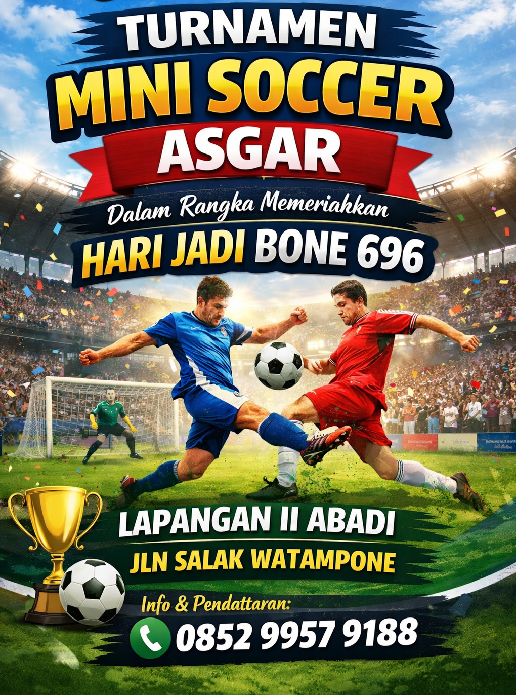 Dalam rangka memperingati Hari Jadi Bone (HJB) ke-696, ASGAR (Asli Garut) Futbol Club siap menggelar turnamen mini soccer yang akan berlangsung di Lapangan Rumput Sintetis Abadi Mini Soccer, Jalan Salak, Kelurahan Macege, Kecamatan Tanete Riattang Barat, pada Jumat, 17 April 2026.