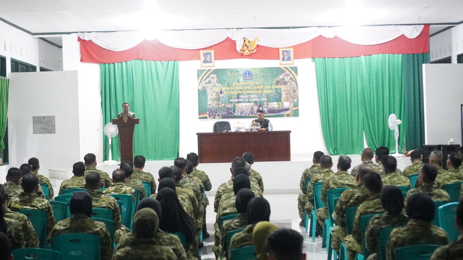 Bupati Bone H. Andi Asman Sulaiman, S.Sos., MM memberikan pengarahan kepada peserta retret di Batalyon Armed 21/Kawali, Kecamatan Bengo, Kamis (23/4/2026).